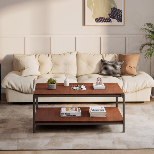 2-Tier Industrial Coffee Table With Storage Shelf For Living Room, Rectangular Wood And Stable Metal Frame End Table, Recessed Accent Furniture For Home, Office, Espresso